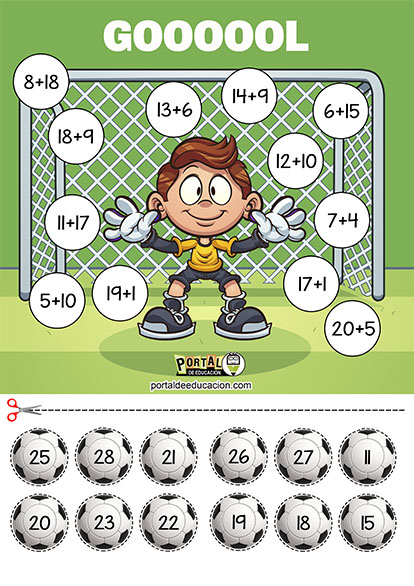 Esta actividad ayuda a los niños a practicar sumas Gooooool Matemático, de una manera divertida. En la parte de arriba de la hoja hay un portero con varios círculos que tienen sumas. Abajo hay pelotas con números. Los niños deben resolver las sumas y pegar la pelota con el número correcto en el lugar que le corresponde.
