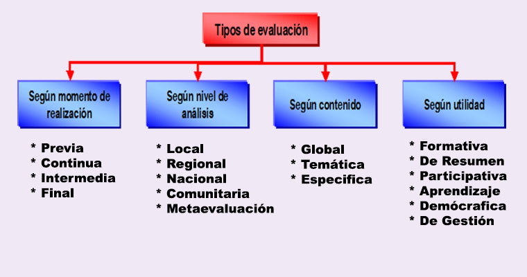 Existen muchos tipos de evaluación. Muchas particularidades del proceso evaluativo vienendadas por el momento en que la misma se implementa, es decir, en función del ámbito temporal que
